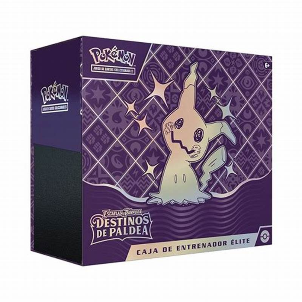 Pokémon TCG: Scarlet & Violet – Paldean Fates Elite Trainer Box – Inglés es una caja oficial sellada del Juego de Cartas Coleccionables Pokémon. Esta edición incluye 9 sobres de la expansión Paldean Fates, una carta promocional foil de Shiny Mimikyu, accesorios de juego como fundas con diseño exclusivo, contador de daño, marcadores de estado, una guía del jugador y una caja coleccionable con divisores.